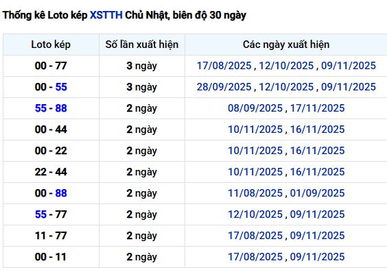 Hình ảnh thống kê lô kép 30 ngày gần nhất cho XSTTH Chủ Nhật cho thấy: